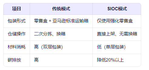 為解決這一痛點(diǎn),亞馬遜推出了 SIOC(Ship in Own Container) 包裝計劃,并配套嚴(yán)格的 SIOC包裝運(yùn)輸測試,推動品牌商直接使用可運(yùn)輸?shù)脑瓘S零售包裝發(fā)貨,實(shí)現(xiàn)“從工廠到消費(fèi)者手中”的直達(dá)交付。