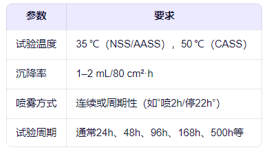 pH值:6.5–7.2(NSS)或3.1–3.3(AASS/CASS)