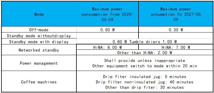 待機和關機模式下的限值下限仍保持在0.50瓦,關機模式下的限值下限從2027-05-09開始提高到0.30瓦。
